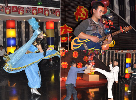 晚會(huì)在現(xiàn)代團(tuán)體舞《快樂寶貝》激情歡快的節(jié)奏中拉開序幕。在隨后上演的眾多節(jié)目中,歌曲串燒、表演秀、神奇魔術(shù)、詼諧小品、武術(shù)表演等幽默勁爆節(jié)目給廣大員工帶來強(qiáng)烈的感官?zèng)_擊,現(xiàn)場(chǎng)觀眾情緒高漲、熱鬧歡騰;接下來,婉轉(zhuǎn)悠揚(yáng)的笛子演奏、夢(mèng)幻的藏族、新疆舞蹈,以及優(yōu)雅歡快的爵士舞蹈又把晚會(huì)現(xiàn)場(chǎng)帶入另一個(gè)高雅唯美的情感世界。整場(chǎng)晚會(huì),在全體參與人員的共同努力下,通過不同節(jié)奏的變換、不同主題的穿插,為全體同事呈現(xiàn)了一場(chǎng)豐富、豐厚、豐滿的文化藝術(shù)大餐。