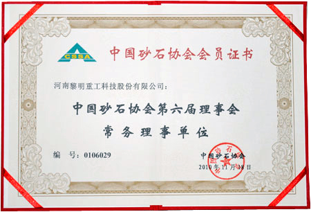 公司一直是中國砂石協會理事單位,眾多產品經廣泛的市場應用,贏得了國內外客戶的普遍贊譽,被中國砂石協會確定為推薦設備。本屆再次由新換屆的中國砂石協會推薦為常務理事單位,表現了中國砂石協會對黎明重工科技產品質量的充分認可。