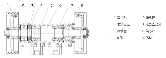 檢查飛、槽輪配重中心位置是否正確,槽輪配重中心應(yīng)通過主軸中心孔與主軸偏心孔相對(duì)應(yīng)180度成為一條直線。
