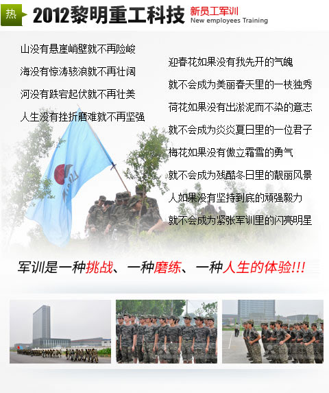 黎明重工科技自2004年啟動(dòng)大學(xué)生員工計(jì)劃以來(lái),軍訓(xùn)拓訓(xùn)已成為每一位新員工入職的必經(jīng)之路。百余位職場(chǎng)新人朝夕相對(duì),統(tǒng)一的作息時(shí)間,近似嚴(yán)苛的軍訓(xùn)項(xiàng)目,蘊(yùn)藏深意的拓訓(xùn)內(nèi)容。流火的七月,肆意揮灑的汗水,熱情洋溢的青春,2012屆新進(jìn)職員,即將在這里開(kāi)啟人生新的篇章。