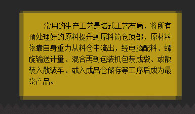 常用的生產(chǎn)工藝是塔式工藝布局,將所有預(yù)處理好的原料提升到原料筒倉頂部,原材料依靠自身重力從料倉中流出,經(jīng)電腦配料、螺旋輸送計(jì)量、混合再到包裝機(jī)包裝成袋、或散裝入散裝車、或入成品倉儲(chǔ)存等工序后成為產(chǎn)品。