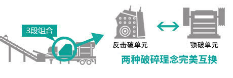 三組合移動站一種車身為8種機型通用,喂料單元互換系統(tǒng)、破碎單元互換系統(tǒng)和篩分單元互換系統(tǒng),只需再投資單機設備成本,短時間內,即可在同一車身上實現(xiàn)不同型號喂料單元、破碎單元和篩分單元互換系統(tǒng),整機各系統(tǒng)之間的準確匹配,適應場合更廣泛,破碎功能更優(yōu)良,客戶的消費品得到增值。