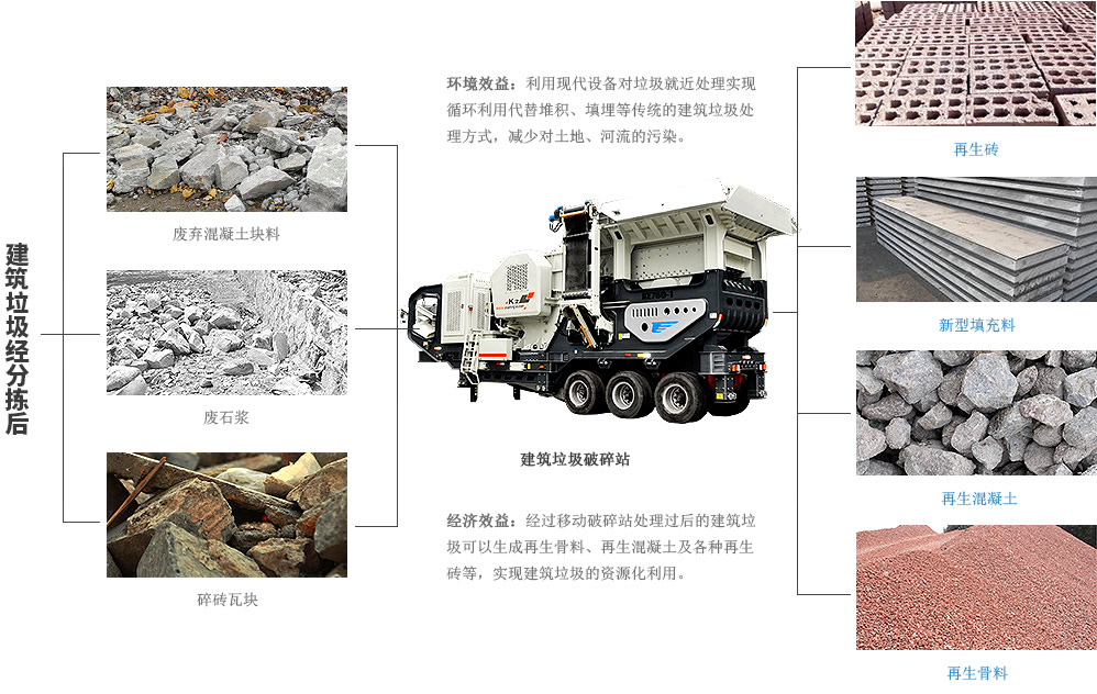 四組合移動站黎明重工針對建筑垃圾處理,秉承環(huán)保理念,憑借豐富的礦山機械研發(fā)經驗與技術支撐推出了移動破碎站組合設備,對建筑垃圾中的廢物進行分揀、剔除或者破碎,使之作為再生資源被重新利用,構建城市文明!