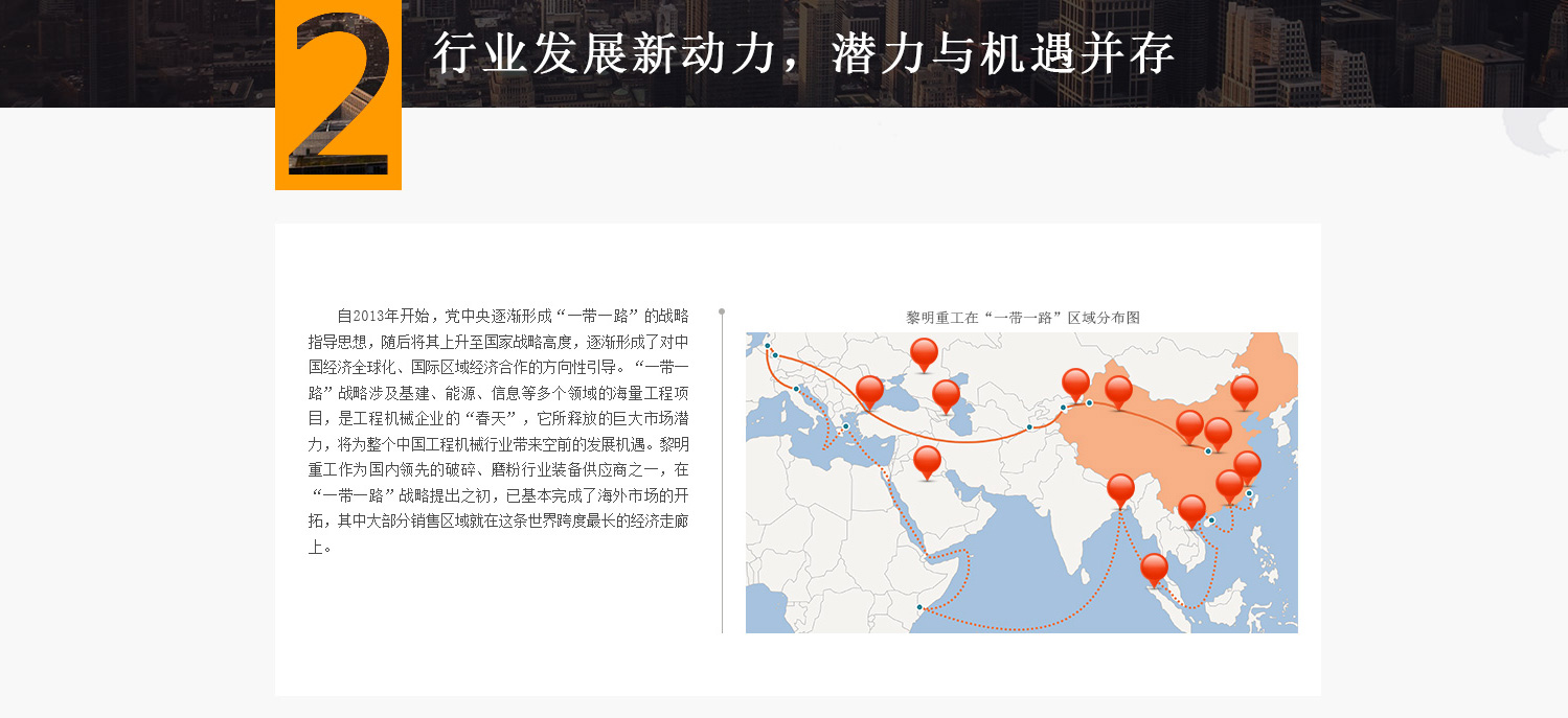 自2013年開始,黨中央逐漸形成“一帶一路倡議”的戰(zhàn)略指導(dǎo)思想,隨后將其上升至國家戰(zhàn)略高度,逐漸形成了對(duì)中國經(jīng)濟(jì)全球化、國際區(qū)域經(jīng)濟(jì)合作的方向性引導(dǎo)。“一帶一路倡議”戰(zhàn)略涉及基建、能源、信息等多個(gè)領(lǐng)域的海量工程項(xiàng)目,是工程機(jī)械企業(yè)的“春天”,它所釋放的巨大市場潛力,將為整個(gè)中國工程機(jī)械行業(yè)帶來發(fā)展機(jī)遇。黎明重工作為國內(nèi)知名的破碎、磨粉行業(yè)裝備供應(yīng)商之一,在“一帶一路倡議”戰(zhàn)略提出之初,已基本完成了海外市場的開拓,其中大部分銷售區(qū)域就在這條世界跨度最長的經(jīng)濟(jì)走廊上。