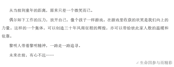 對(duì)運(yùn)動(dòng)會(huì)的憧憬,似乎斷在了畢業(yè)照的咔擦聲里。初入職場的你,每天在手忙腳亂里一點(diǎn)點(diǎn)褪去學(xué)生氣. 三年后的你, 工作節(jié)奏終于從容,激情卻隱在時(shí)光里;在職場馳騁過十年,白駒過隙里你嘆著氣恐懼著中年危機(jī)。是你嗎?不該是你!因?yàn)樵谶@里,青春,不畢業(yè)! 無數(shù)個(gè) 精彩瞬間 值得鐫刻 看起來些許幼稚的游戲卻讓一群人脫下工裝,如孩童般歡呼跳躍。和有趣的人一起做有趣的事,快樂從未這樣簡單過。 我的榮譽(yù)是 身旁 有你 是相遇的那份慶幸,讓彼此都活得盡興。 是你們,陪著我一起鬧,一起笑,一起忘掉不快,享受現(xiàn)在。